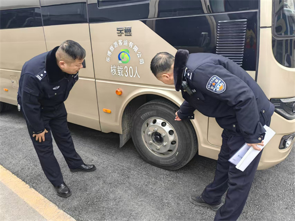 检查过程中,民警重点查阅了企业车辆安全技术档案、驾驶人资质台账、车辆日常保养维护记录及动态监控平台运行情况,详细询问企业节日期间车辆排班调度、驾驶人安全教育培训等工作落实情况。同时,还实地抽查了部分客运车辆的安全设施配备情况,仔细检查车辆轮胎、制动系统、灭火器、安全锤及应急逃生门窗是否齐全有效,对检查中发现的安全隐患,现场下达整改通知书,明确整改时限和要求,督促企业负责人立行立改、闭环管理。